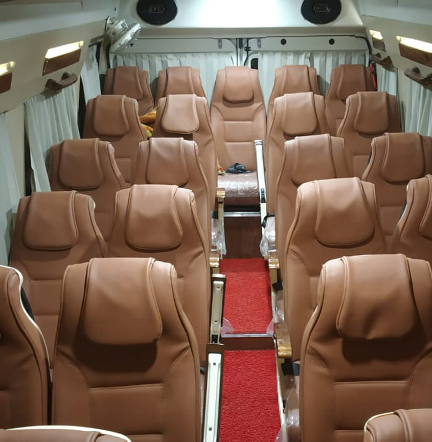 Luxury & Comfort: Our luxury tempo travellers are designed for comfort, with plush seating, air-conditioning, entertainment systems, Wi-Fi and charging ports, full-fledged amenities for an optimal travel experience.